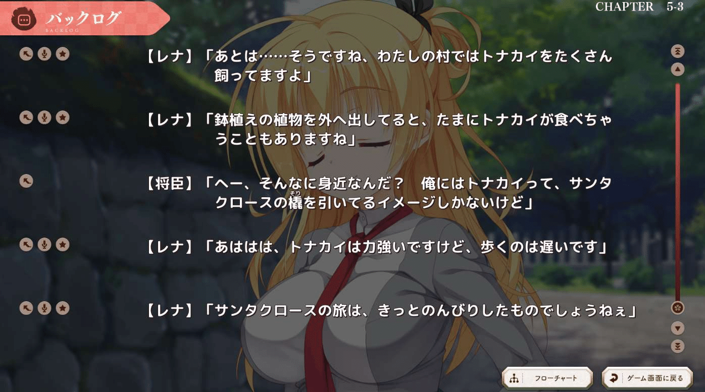 そんな中、人一倍口数の多いレナがその綱渡りをあざやかに渡っていく様は見ていて痛快。上記会話とか完璧に最高。平和。ピンフ。「俺にはトナカイって、サンタクロースのそりを引いてるイメージしか無いけど」に対する「サンタクロースの旅は、きっとのんびりしたものでしょうねぇ」って返し、アンミカの「幸せの『し』ですよ」に匹敵するだろ。言い回しが素敵すぎます。
