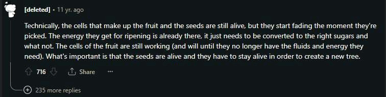 収穫された林檎は「生きている」のか「死んでいる」のか気になって調べようとしたら戦争始まってた。「235 more replies」の絶望感わろた。