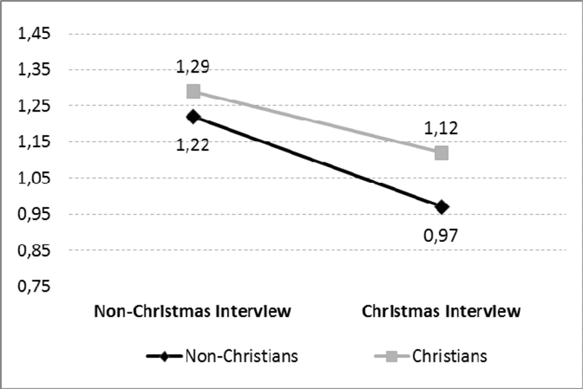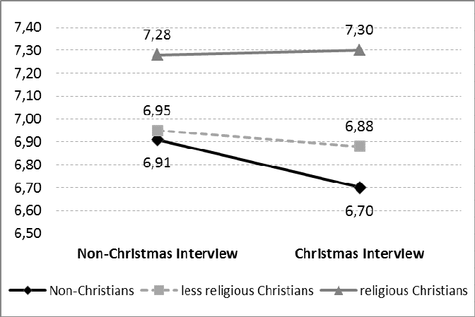興味深いデータを見つけた。上はクリスマス期間とそうでない期間の人生満足度調査の差、下はemotional well-beingの差です。