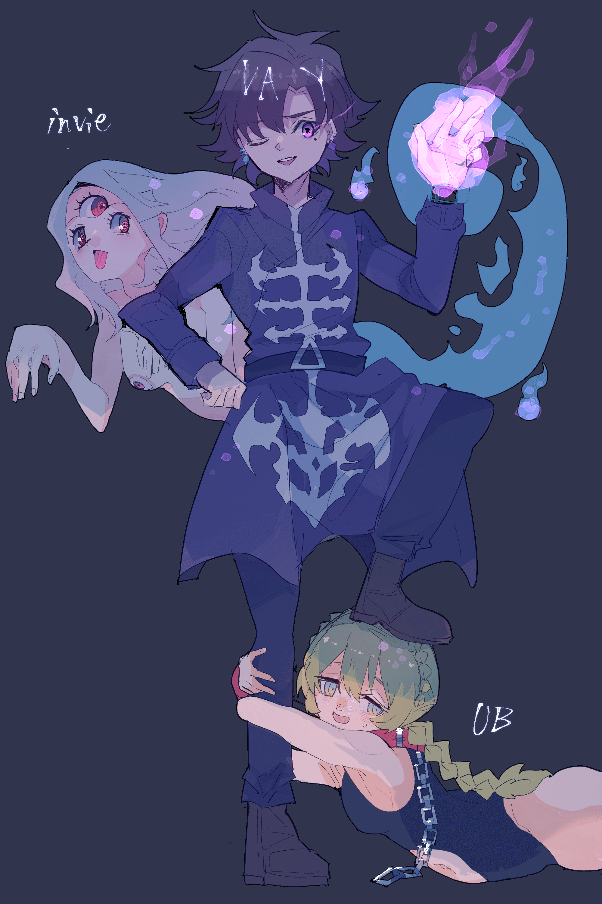 周りにいるのはヴァイにしか視えない幽霊。UB(ユビキタス)はヴァイ大好きなドMの奴隷(自称)でインビーはそうでもなく単にオモロいから一緒にいる姐さん。