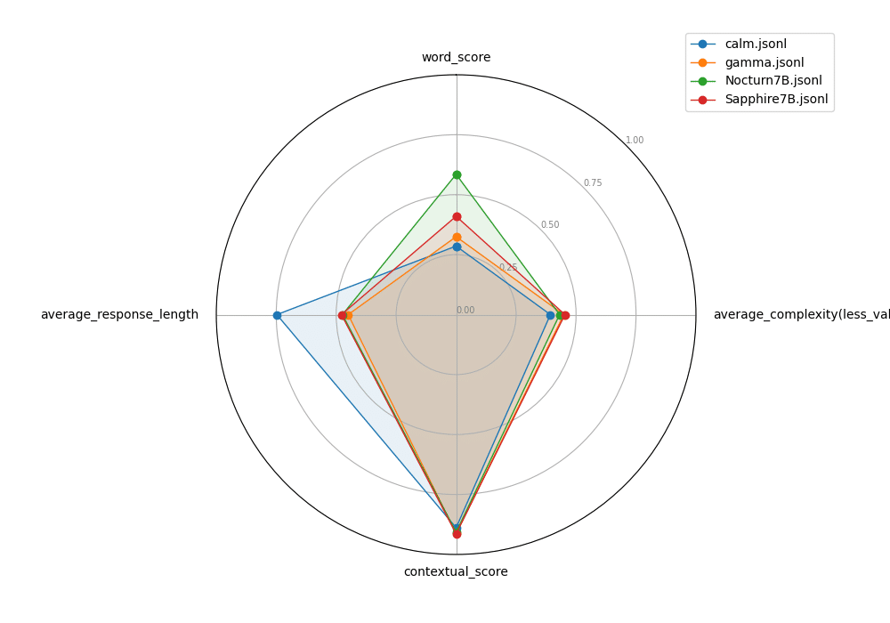 自作CITY’d。サファイアが私が作った最新のモデルで、なろうデータセット70GB分くらいと個人的に好きな小説を全ぶっ込みしたやつ。word scoreはセンシティブさだから、エロのみでトレーニングしたノクターンが高いのは当然として、サファイア非常に優秀です。チャットじゃなくてライトな文章生成に限ればマジで今世界で一番性能いいと思う。