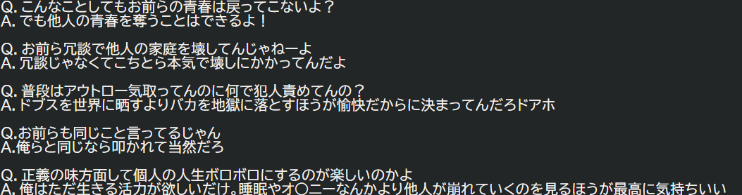 また、真逆といったがそれは北極と南極のような距離ではなくコインの表裏ほどのものかもしれない。上のdisgustingなコピペ、げに注目していただきたいのは最後の部分です。「俺はただ生きる活力が欲しいだけ。」その他すべての行いは樹木の枝であり、地に這った根は”ここ”にある。そうして誰もがそうである。アア哀しいね……。